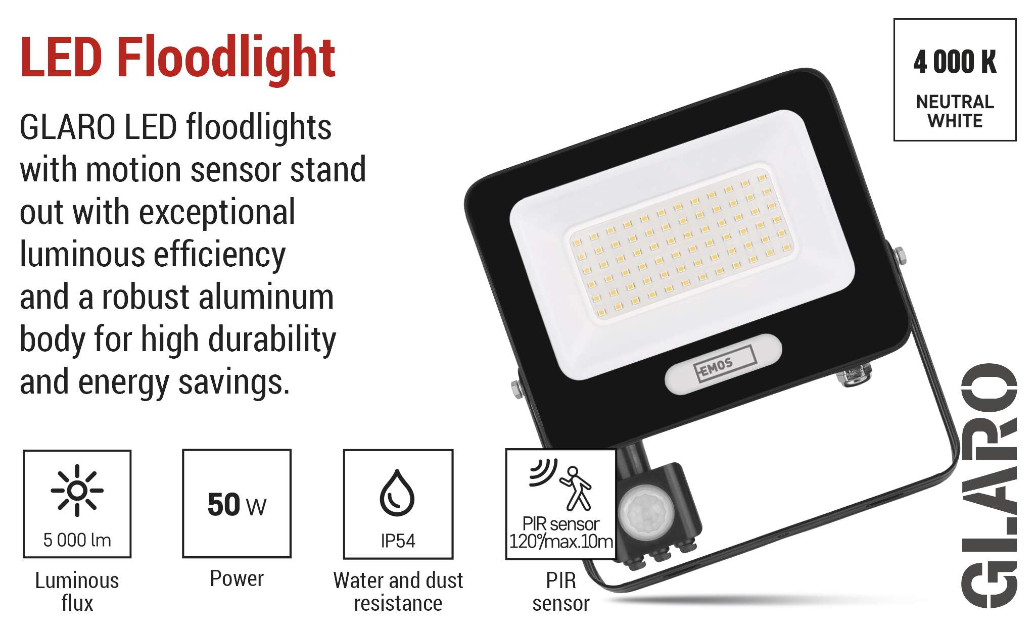 LED prožektori GLARO ar PIR sensoru nodrošina ērtu un enerģiju taupošu āra apgaismojumu. Pateicoties automātiskai pārslēgšanai, kad tiek konstatēta kustība, tie iedegas tikai tad, kad tie patiešām ir nepieciešami - ideāli piemēroti, lai palielinātu drošību un komfortu jūsu īpašumā. Prožektori ir piemēroti uzstādīšanai zem jumta vai pie ēkas sienas, un tie ir aizsargāti ar IP54. Tie ir praktisks risinājums iebrauktuvju, garāžu, dārza celiņu, piebraucamo ceļu un uzņēmumu telpu apgaismošanai. Vienkārša sensora jutības un apgaismojuma ilguma regulēšana ļauj pielāgot apgaismojumu atbilstoši jūsu vajadzībām.