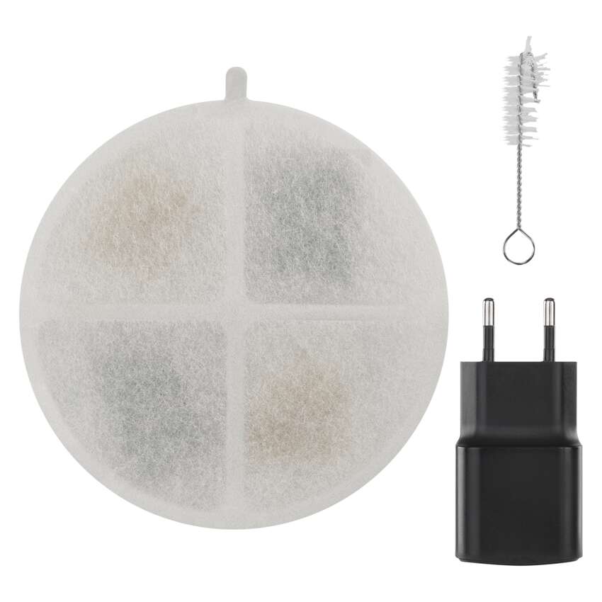| iepakojuma saturs | strūklaka, strāvas adapteris, strāvas kabelis, sūknis, sūkņa filtrs, kokvilnas filtrs, tīrīšanas birste |