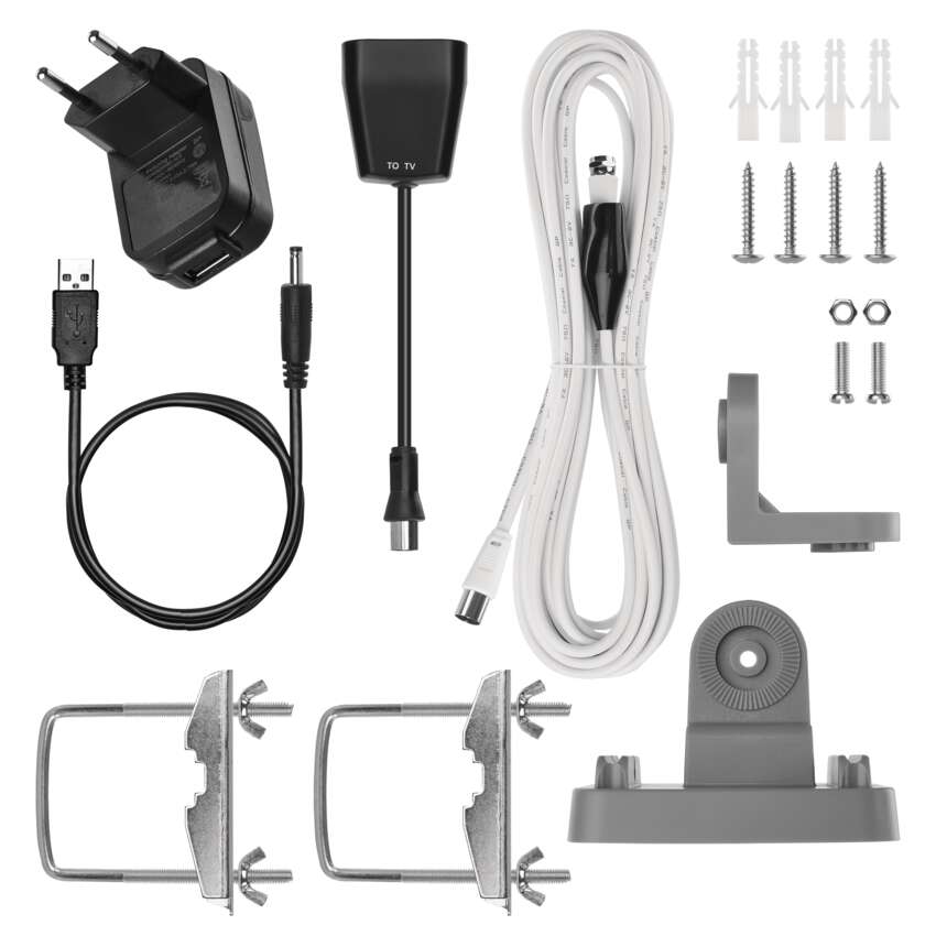 Lielā EMOS antenas priekšrocība ir tā, ka to darbina uz USB adaptera. Pateicoties šim universālajam barošanas avotam, antenu var ērti izmantot arī vietās, kur nav 230 V elektrotīkla sprieguma, piemēram, treilerī vai atvaļinājumā uz kuģa. Antena tiek piegādāta ar barošanas avotu USB kabeļa un USB barošanas bloka veidā.