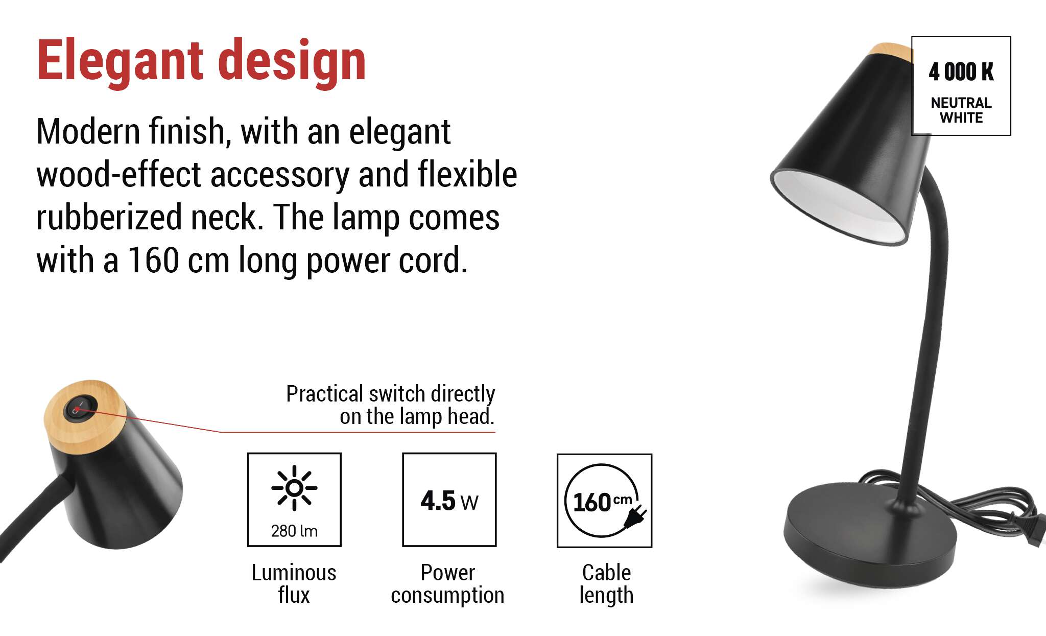 Lampa ir aprīkota ar praktisku slēdzi tieši uz lampas galviņas, tāpēc to var ieslēgt ar vienu spiedienu, nemeklējot slēdzi uz vada. Pateicoties 1,6 m garajam barošanas vadam, jums ir pietiekami daudz vietas, lai to ērti novietotu uz jebkura galda vai rakstāmgalda.