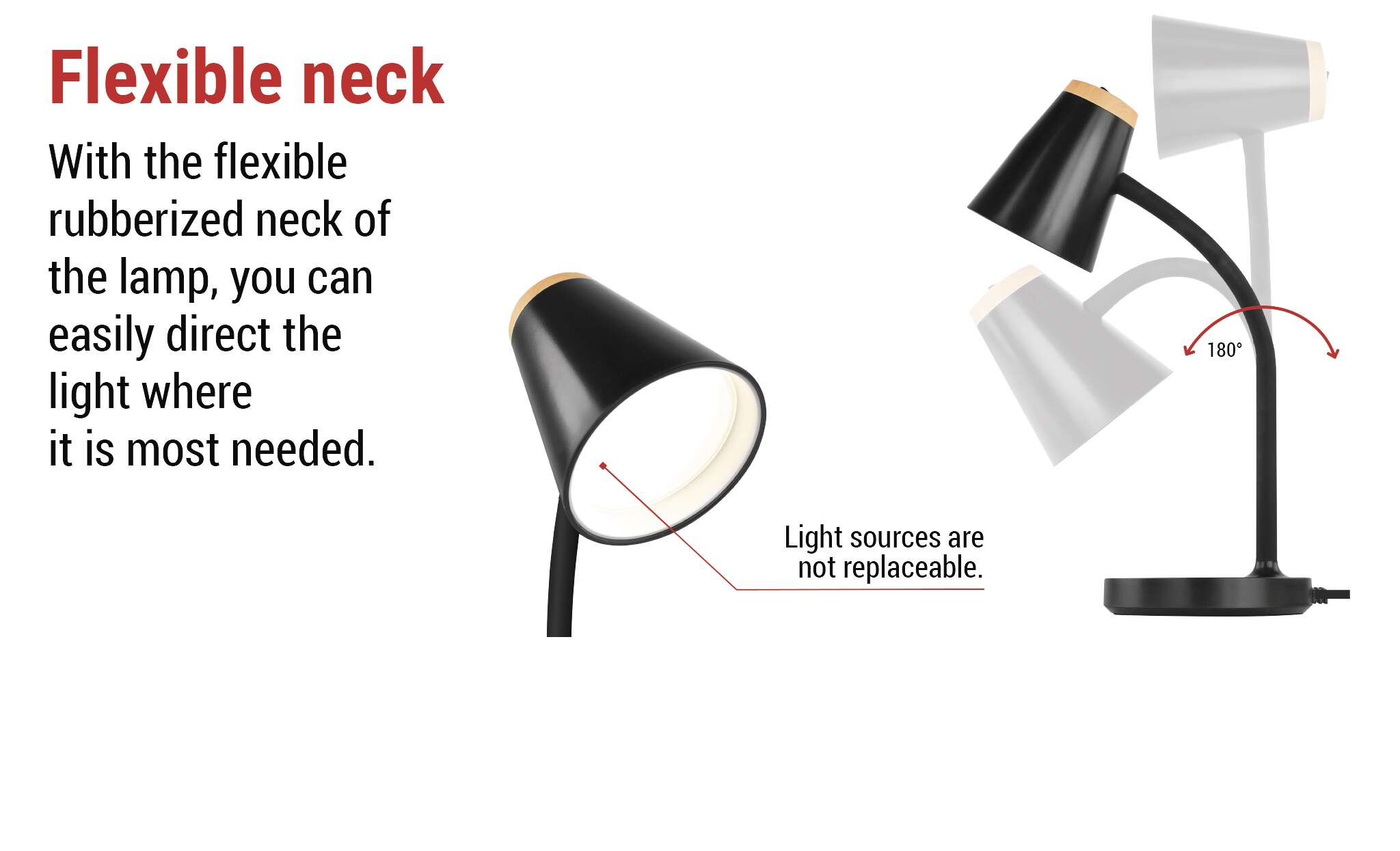 Dēļ lokanā kakla jūs varat novirzīt gaismu tieši tur, kur jums tas nepieciešams. Tādējādi lampa lieliski pielāgojas jūsu pašreizējām vajadzībām - neatkarīgi no tā, vai lasāt, strādājat ar datoru vai mācāties. Kompaktais izmērs arī ietaupa vietu, savukārt stabilais pamatnis nodrošina drošu lietošanu