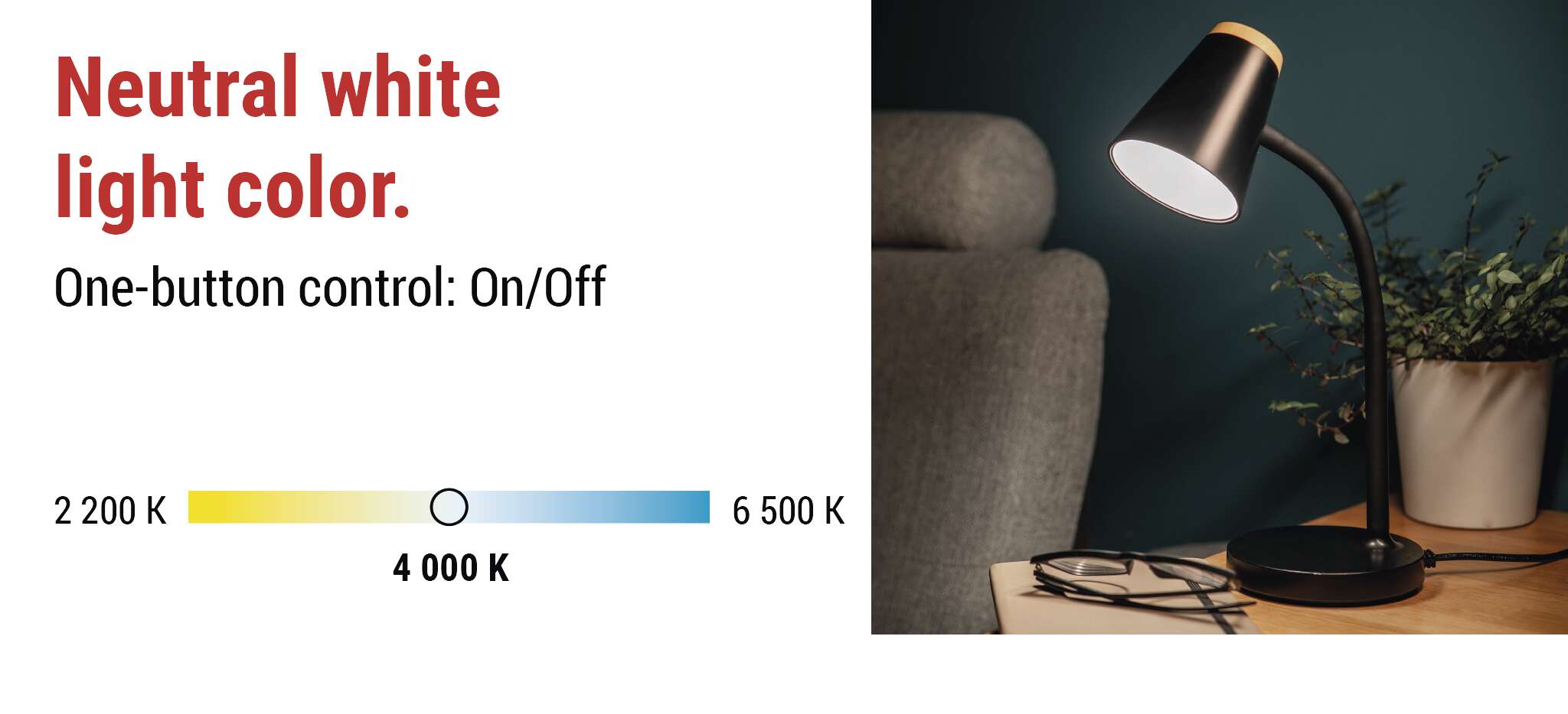 Iegulētais 4,5 W LED gaismas avots nodrošina neitrālu baltu gaismu (4000 K), kas nenogurdina acis un rada patīkamu atmosfēru koncentrētam darbam un atpūtai.
