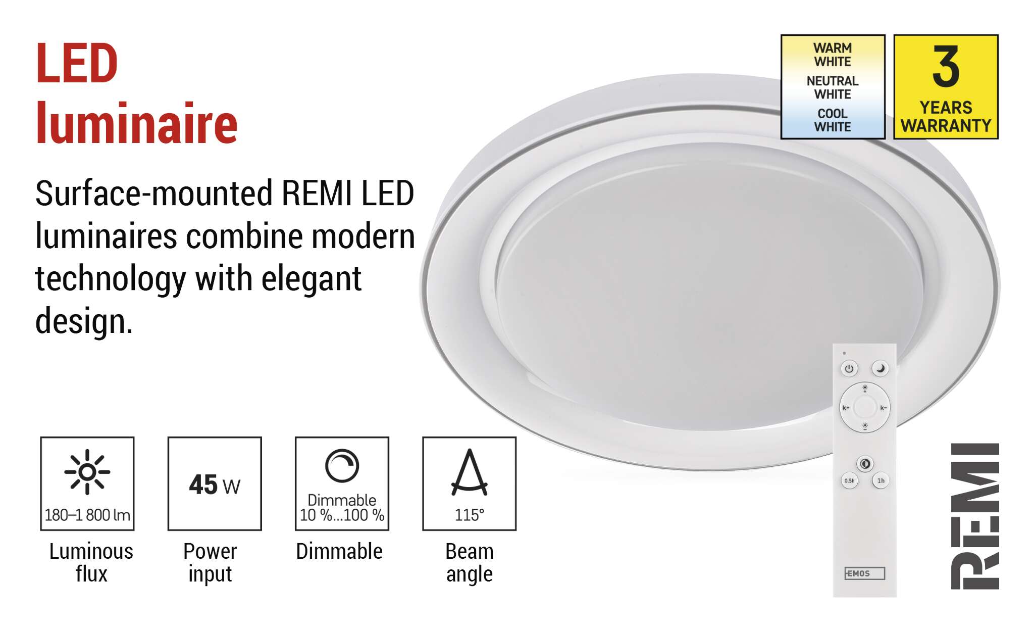 LED lampa REMI, 45 W, silti-auksti balta, aptumšojama ar tālvadības pulti