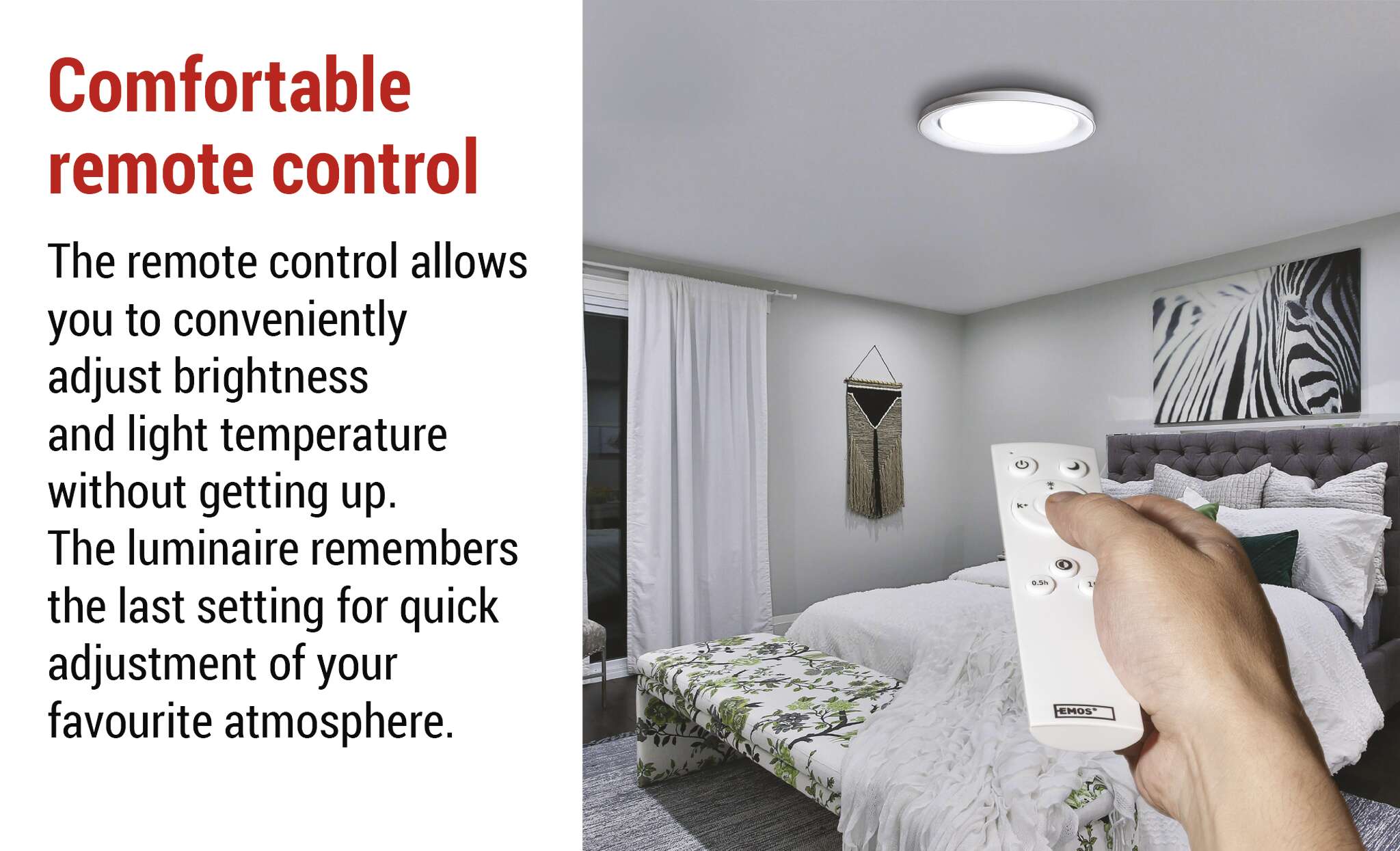 Jūs varat viegli pārslēgt starp siltu un vēsu balto krāsu, vienmērīgi aptumšojot, lai radītu ideālu atmosfēru katram brīdim - no mierīgas vakara atpūtas līdz mērķtiecīgam darbam. Turklāt atmiņas funkcija ļauj saglabāt pēdējos iestatījumus vai vienu iecienītāko ainu, lai gaisma vienmēr pielāgotos jūsu vēlmēm. Tālvadības pults padara gaismekļa ikdienas lietošanu pilnīgi intuitīvu un ērtu, un jūsu telpa uzreiz iegūst perfektu atmosfēru.
