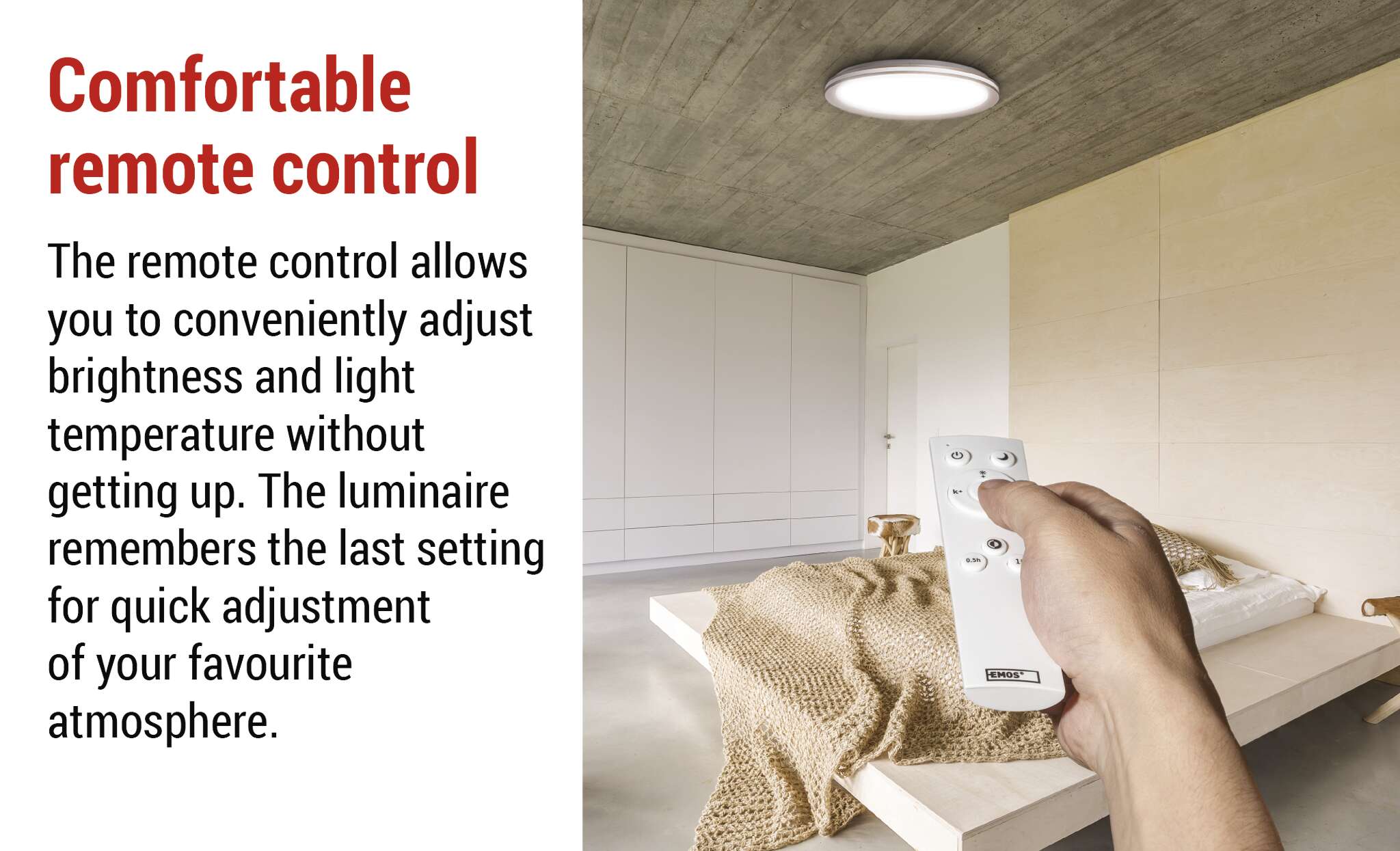 Jūs varat viegli pārslēgt starp siltu un vēsu balto krāsu, vienmērīgi aptumšojot, lai radītu ideālu atmosfēru katram brīdim - no mierīgas vakara atpūtas līdz mērķtiecīgam darbam. Turklāt atmiņas funkcija ļauj saglabāt pēdējos iestatījumus vai vienu iecienītāko ainu, lai gaisma vienmēr pielāgotos jūsu vēlmēm. Tālvadības pults padara gaismekļa ikdienas lietošanu pilnīgi intuitīvu un ērtu, un jūsu telpa uzreiz iegūst perfektu atmosfēru.