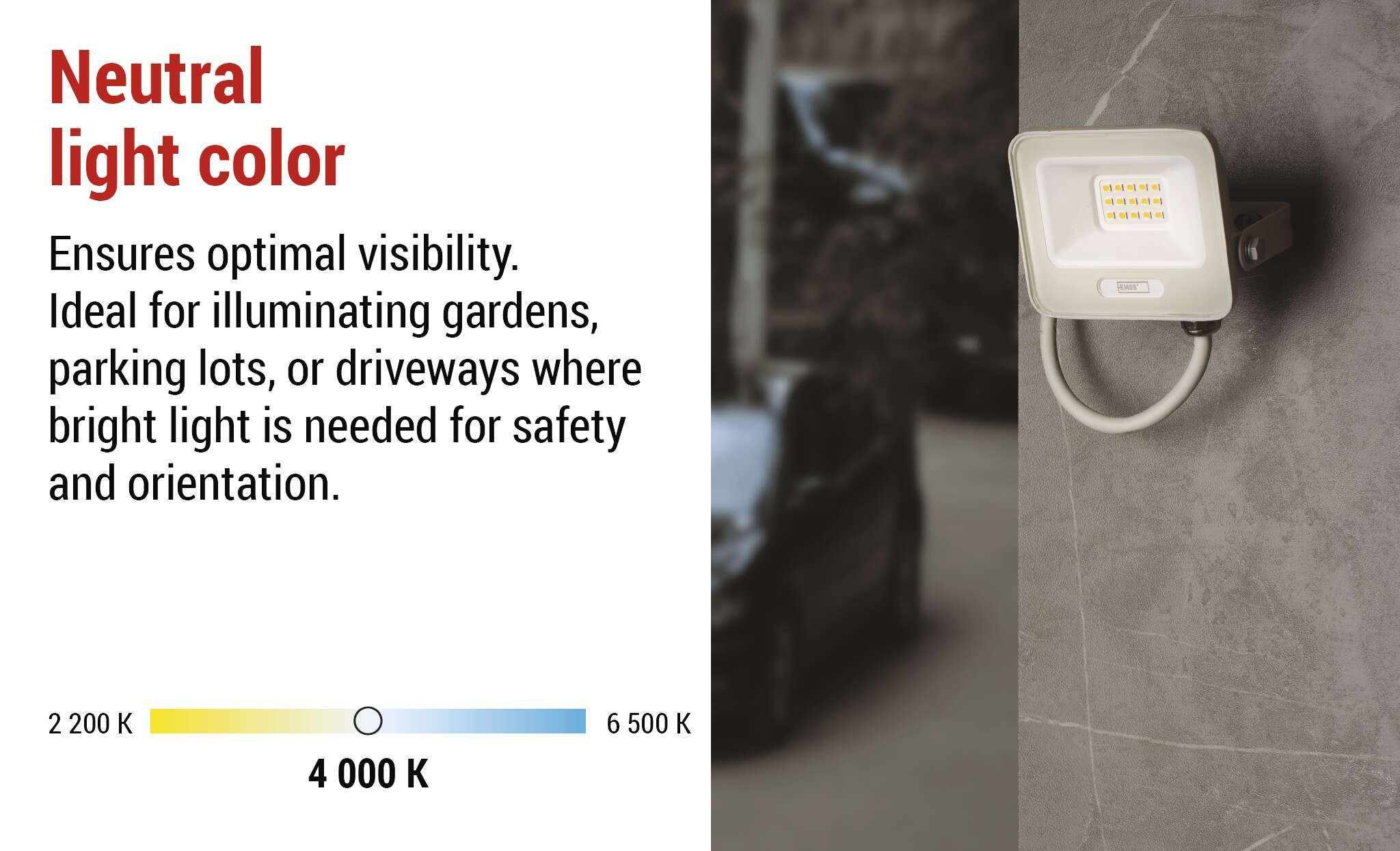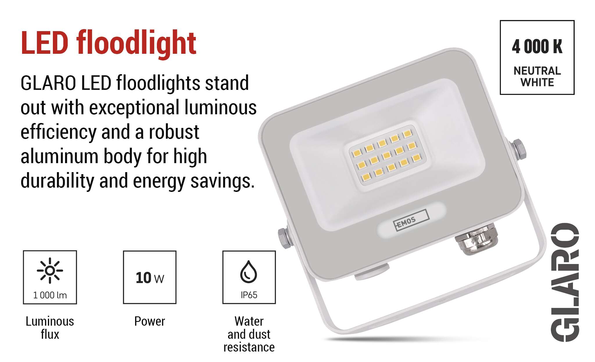 LED prožektors GLARO, 10 W, balts, IP65, 1000 lm, neutraliai baltas