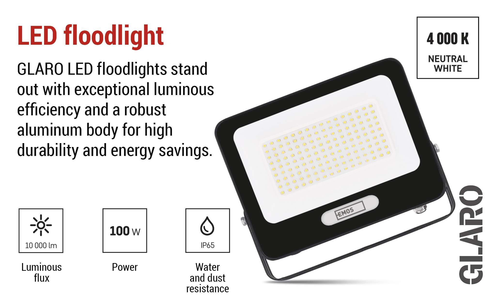 GLARO atstarotājiem ir augsts gaismas lietderības koeficients - 100 lm/W, kas nozīmē, ka tie patērē mazāk enerģijas nekā parastie LED atstarotāji, vienlaikus saglabājot spēcīgu gaismas izvadi. Tas nodrošina spilgtu un efektīvu apgaismojumu ar zemām ekspluatācijas izmaksām neatkarīgi no tā, vai apgaismojat māju, garāžu, dārzu vai komerciālu ēku.