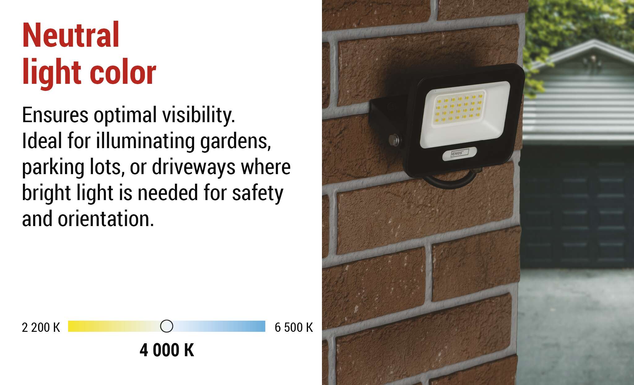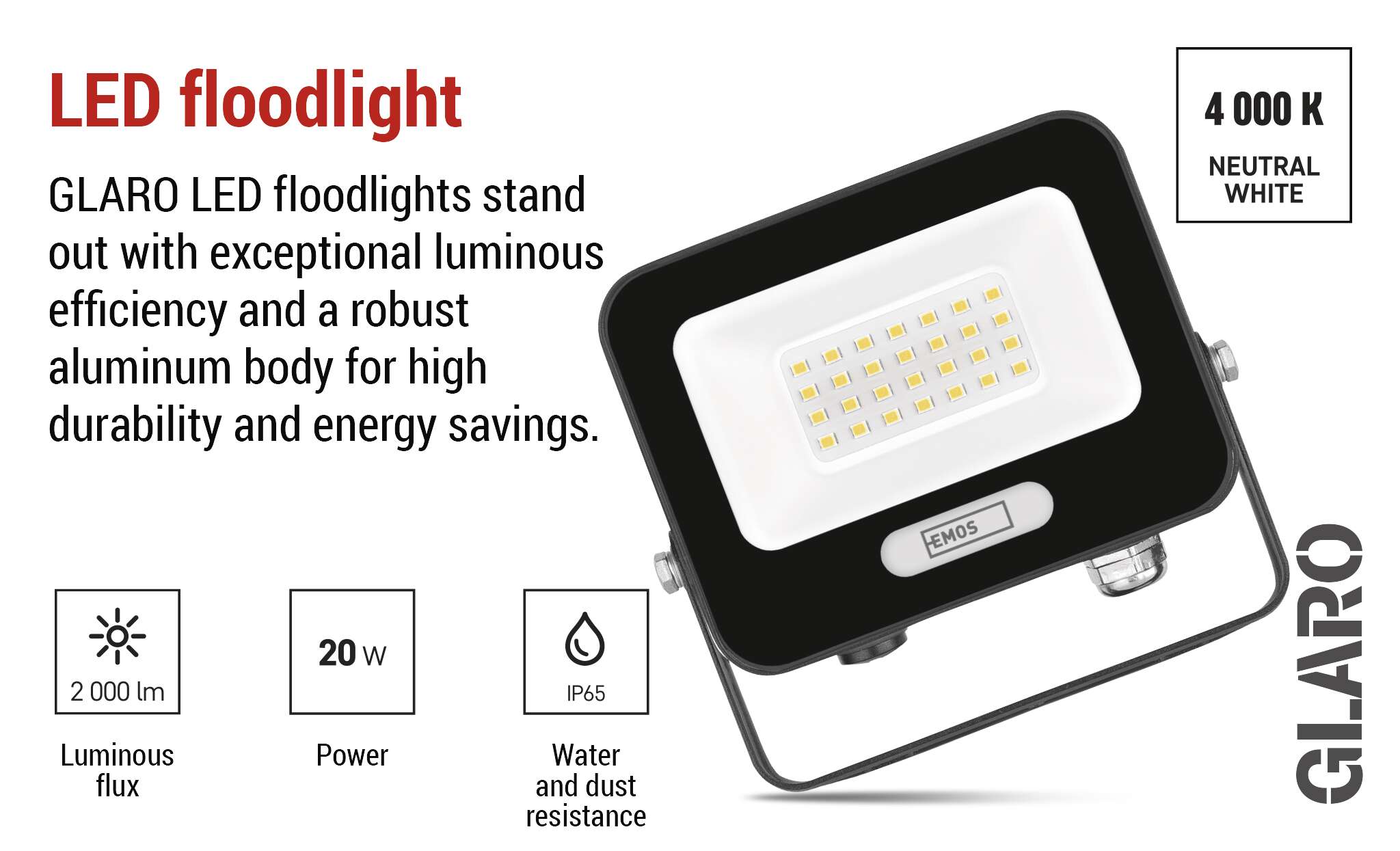 LED prožektors GLARO, 20 W, juodas, IP65, 2000 lm, neutraliai baltas