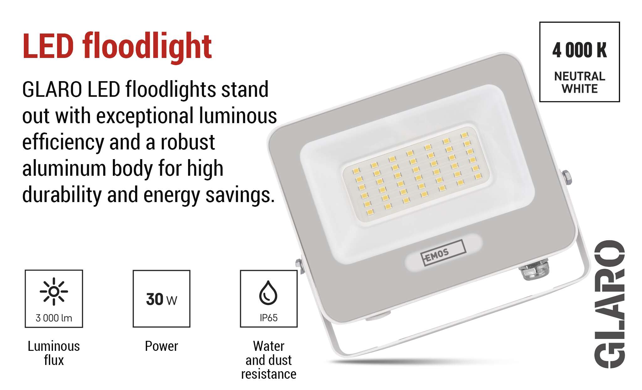 LED prožektors GLARO, 30 W, balts, IP65, 3000 lm, neutraliai baltas