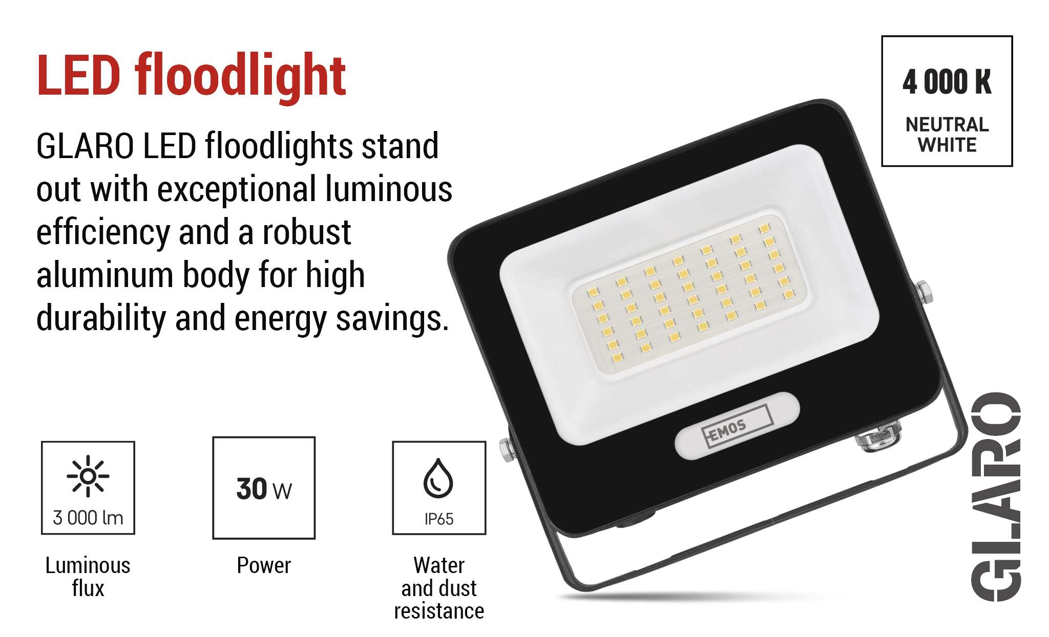 LED prožektors GLARO, 30 W, juodas, IP65, 3000 lm, neutraliai baltas