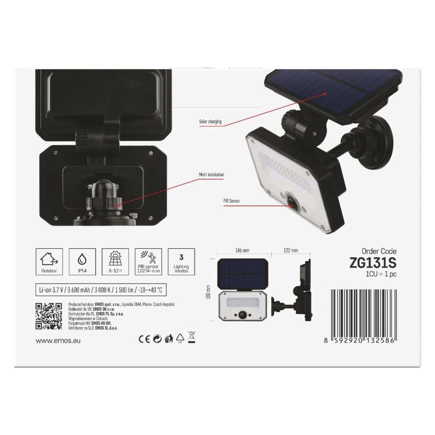 PIR sensors ar diapazonu līdz 6 metriem palīdz pārslēgt gaismekli, kad gaismekļa perimetrā tiek konstatēta kustība. Gaismas režīmu var efektīvi iestatīt, izmantojot aizmugurē esošo pogu. Gaismeklim ir 3 gaismas režīmi. Siltā baltā gaisma (3000 K) izstaro līdz 1500 lm