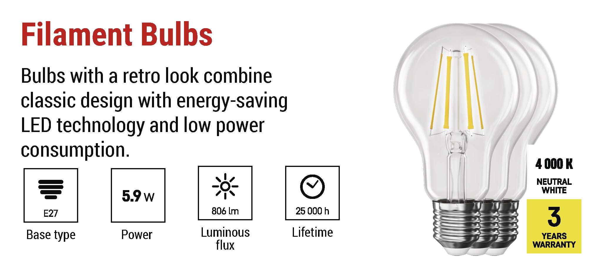 FILAMENT LED spuldzes nodrošina augstu gaismas efektivitāti, ilgu kalpošanas laiku un zemu enerģijas patēriņu. Klasiskās formas un standarta kontaktligzdas viegla uzstādīšana un momentēts apgaismojums ar pilnu jaudu nodrošina komfortu ikdienas lietošanā. Tās ir ražotas, īpašu uzmanību pievēršot kvalitātei un uzticamībai, lai jūs ar tām būtu apmierināti ilgu laiku. Tāpēc mēs jums piedāvājam 3 gadu garantiju - jo laba gaisma ir pelnījusi būt droša.