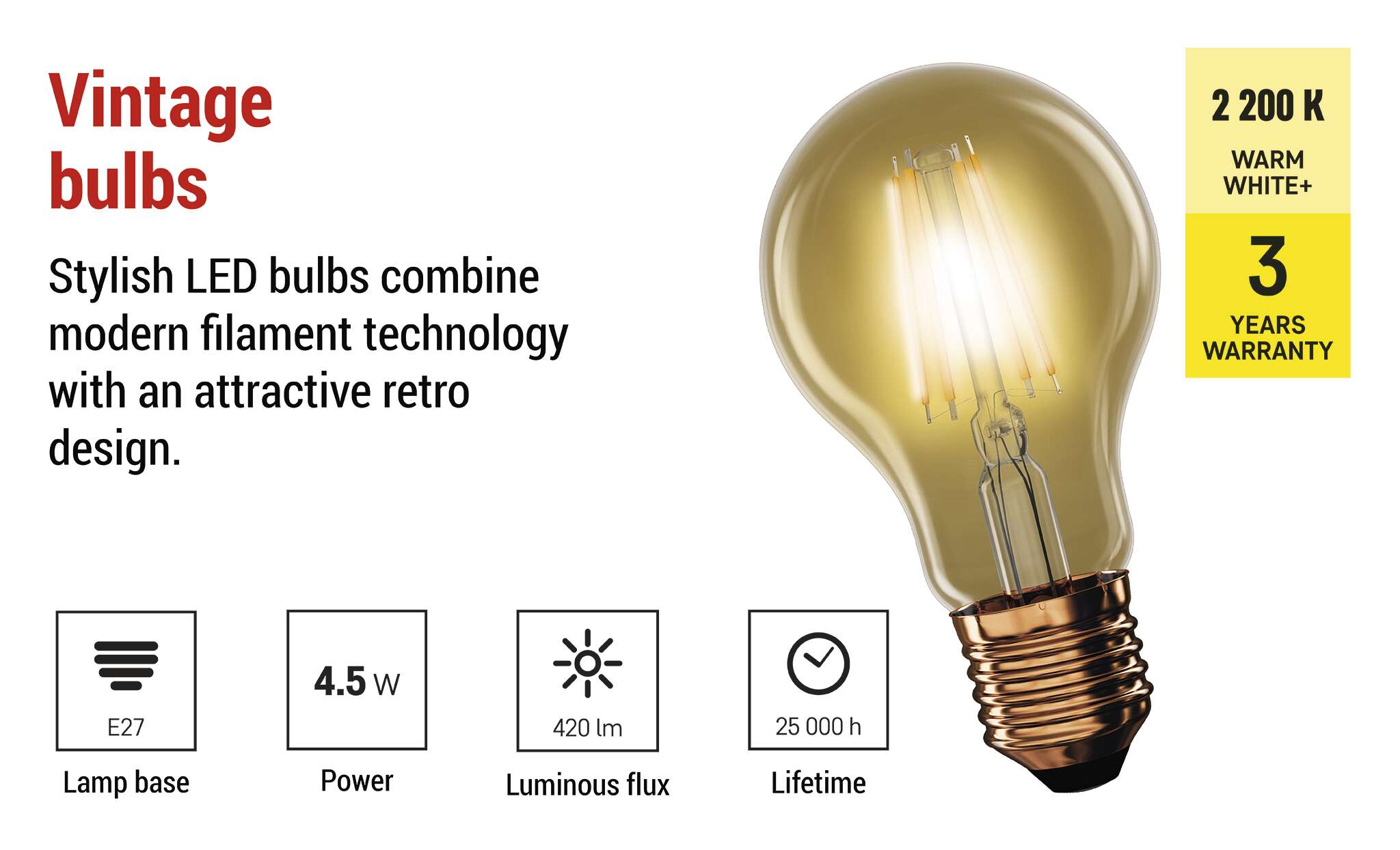LED spuldze Vintage A60 / E27 / 4,5 W (40 W) / 420 lm / Silti balta