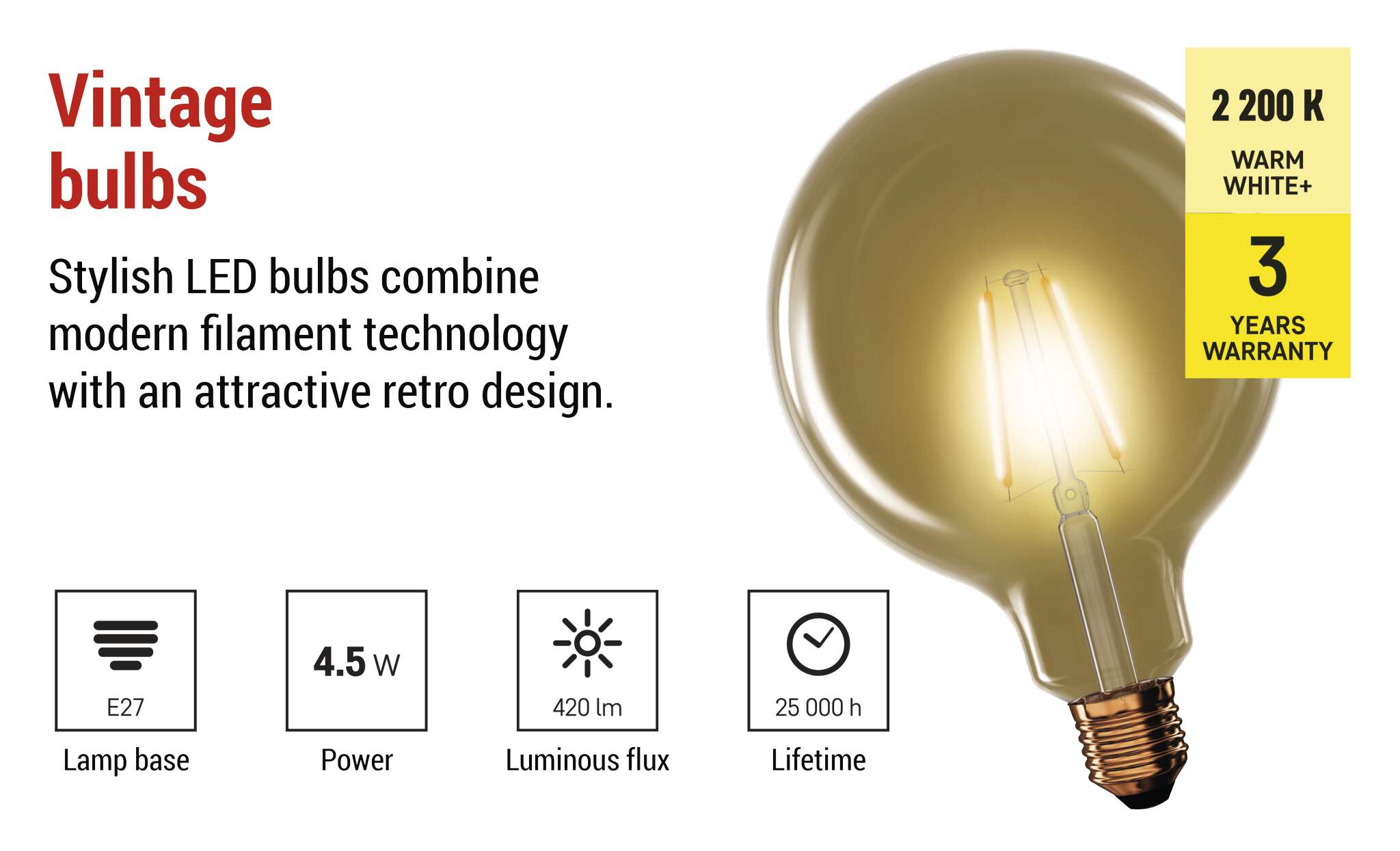 LED spuldze Vintage G125 / E27 / 4,5 W (40 W) / 420 lm / Silti balta