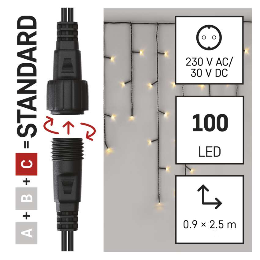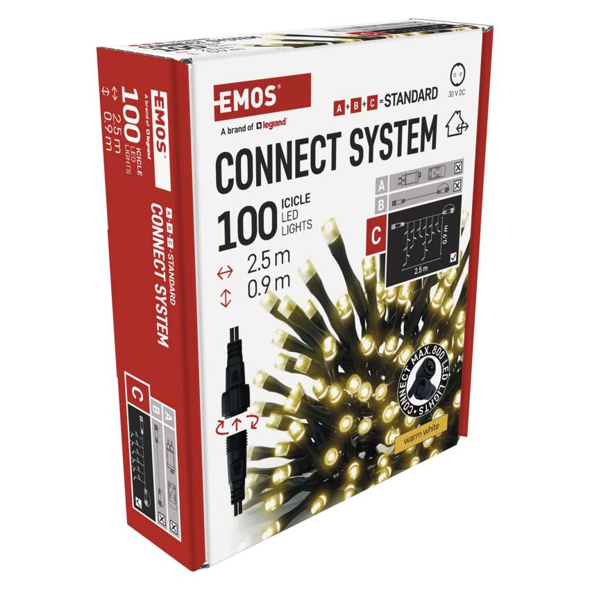 Savienojuma sistēma CONNECT SYSTEM STANDARD ir piemērota izmantošanai iekštelpās un ārpus telpām, pateicoties IP44 aizsardzības pakāpei, taču tikai sezonas laikā, nevis visu gadu. Šīs savienojumu sistēmas priekšrocība ir plašais LED gaismas elementu (C) klāsts dažādās krāsās. Lai gan vispopulārākā Ziemassvētku lampiņa ir ķēdīte, savienošanas sistēmā jūs varat izvēlēties pēc savām dizaina vēlmēm no stalaktītiem, aizkariem, tīkliem vai zvaigznēm eglītes augšdaļai. No viena barošanas avota (A), kas savienots ar pagarinātājiem, centrmezgliem (B) un LED gaismas elementiem (C), var darbināt līdz pat 800 LED lampām .